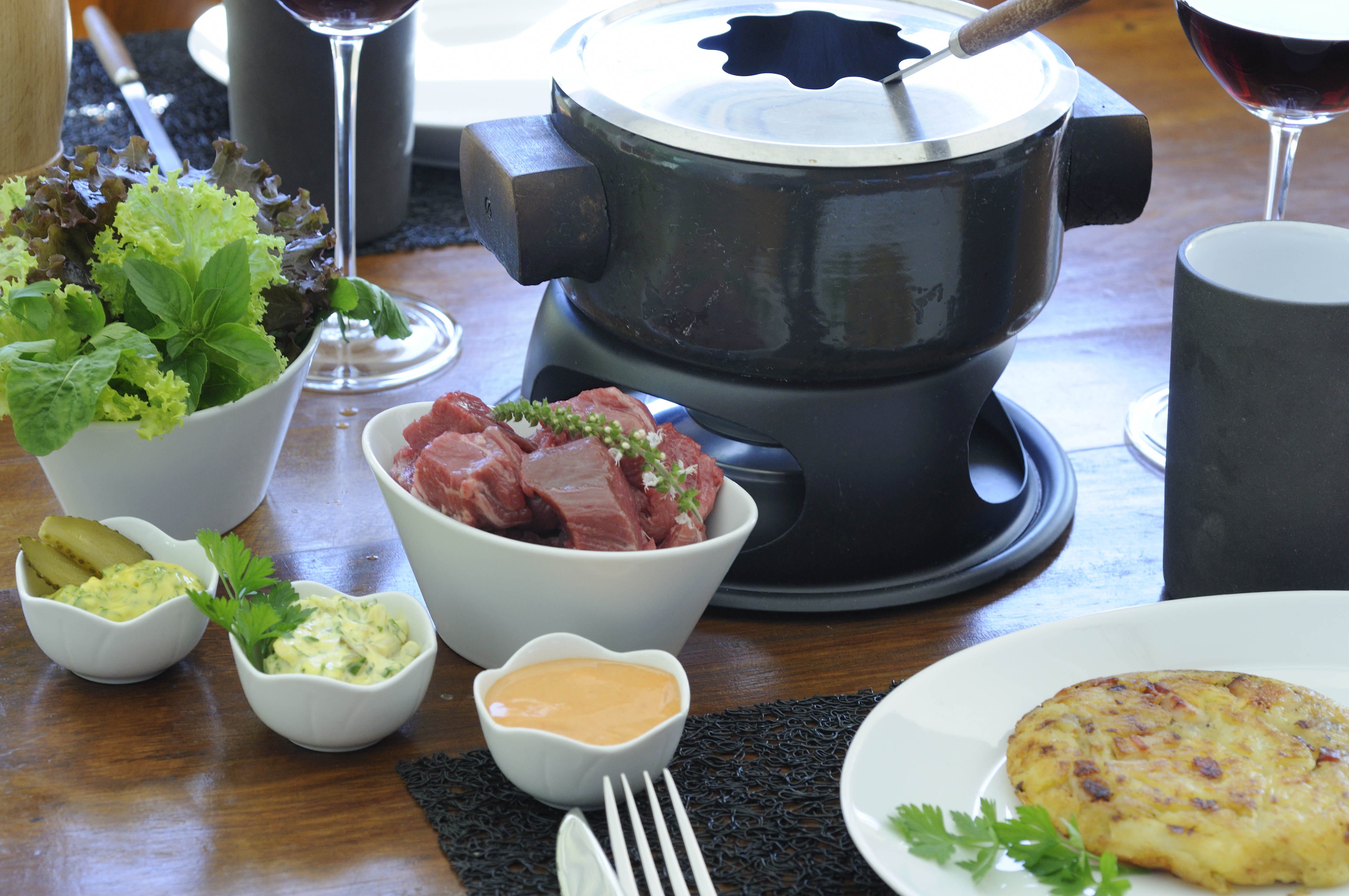 FONDUE DE CARNE AO ÓLEO (R$159) – Filé mignon, peito de frango, lombinho de leitoa e linguiça artesanal. Molhos especiais e acompanhamentos: maionese de ervas finas, molho barbecue caseiro, molho de mostarda Dijon, molho americano, creme de queijo azul, creme poivre vert. Cesta de pães e torradinha