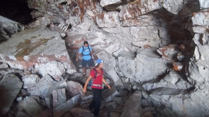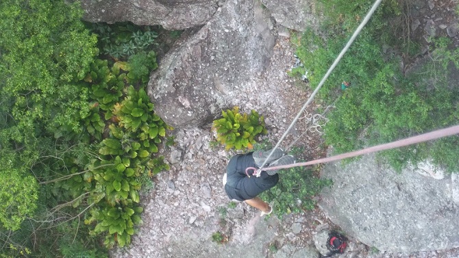 A boca da caverna é de aproximadamente 50m de altura e a saída tem estilo “negativo”, que significa, sem apoio para os pés. Acredito que esta sensação aumenta a adrenalina.