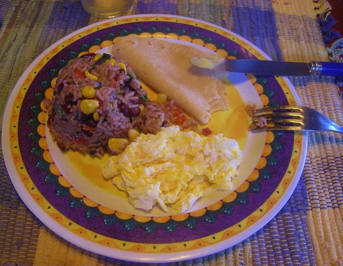 Quanto à comida local, pelo menos para nós brasileiros, não há estranhamento: acho que eles comem mais arroz com feijão do que a gente! Eu prefiro o nosso, porque o deles tem coentro. Um dos pratos principais é o casado: arroz com feijão e você escolhe entre os seguintes acompanhamentos: salada, carne, peixe, frango, batata frita e banana frita. E para café da manhã? Arroz e feijão, de novo? Pois é! Nós comemos o famoso gallo pinto, que é servido em qualquer refeição. É um prato que consiste em arroz e feijão, podendo vir com diferentes acompanhamentos e também receber outros ingredientes, como foi o nosso caso, que veio com ovos mexidos, uma tortilha e foi preparado com milho, pimentão e… Coentro!