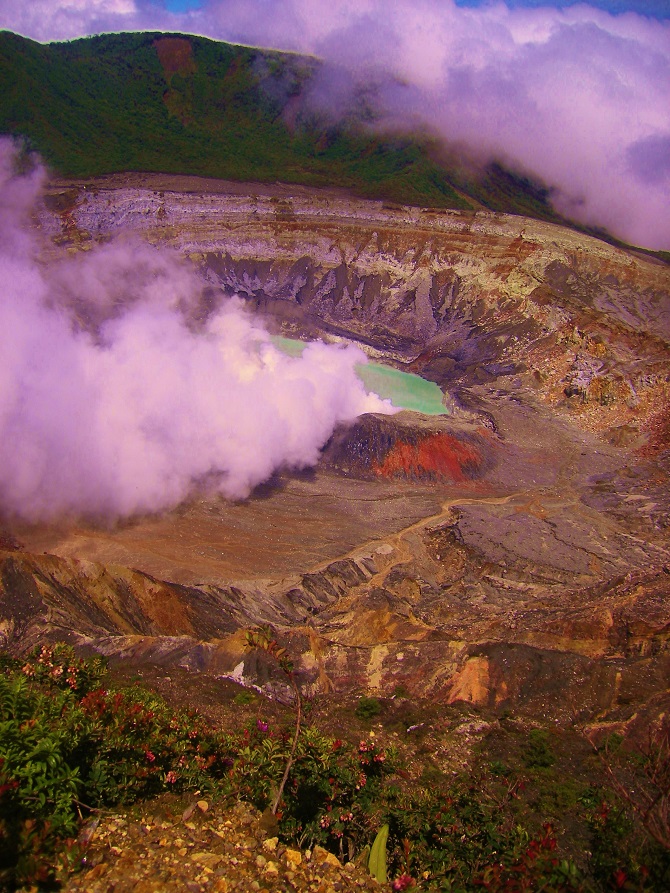 Mas o desejo de ver um vulcão ativo continuava muito forte em nós, então, mantivemos nosso objetivo e, no nosso último dia, viajamos em direção ao Poás. Essa foi a melhor decisão da viagem! Fomos até o parque nacional e andamos numa maravilhosa trilha entre árvores e plantas muito coloridas até pertinho da cratera. De lá, conseguimos ver o vulcão fumegando, ativo, bem debaixo dos nossos pés. Era uma visão imensa, já que a cratera tem 1300 metros de diâmetro e 300 metros de profundidade. Naquele momento pensei: “que bom que estou aqui!” Foi uma experiência inesquecível e a melhor maneira de despedir da Costa Rica!