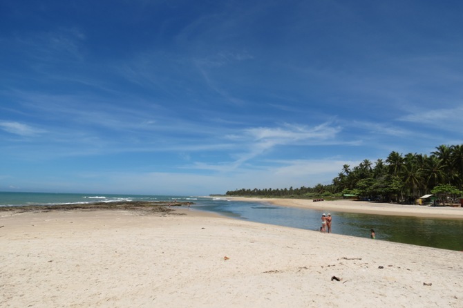Outro passeio imperdível é Dunas de Marapé, no município de Jequiá, a 60 km ao sul de Maceió. O lugar não é tão conhecido e famoso, mas é incrivelmente belo. Uma paisagem ímpar: o encontro das águas escuras da Lagoa de Jequiá com as águas azul turquesa do mar! Ficamos encantados! O acesso se dá pelo povoado de Duas Barras, uma vila de pescadores, onde pegamos a escuna e, num trajeto de cinco minutos, atravessamos o rio Jequiá e chegamos à ponte que dá acesso ao complexo turístico de Dunas de Marapé. Fomos recebidos com um delicioso suco natural de frutas da região, como cortesia. Este lugar cativa tanto aqueles que gostam de água salgada quanto os que preferem água doce, pois de um lado do pontal de areia temos o mar e do outro, a lagoa, ambos repletos de coqueiros e com estrutura simples de praia. Escolhemos permanecer o maior tempo junto à lagoa e nos refrescarmos em suas águas doces e escuras. Muito gostoso também foi pegar aquele sol e tomar aquela água de coco fresquinha. Depois desse período relaxante, nada melhor do que optar por uma das atividades oferecidas no local: passeios de caiaque, de catamarã (embarcação típica) ou de lancha, para explorar melhor a região. Optamos pelo passeio de catamarã que, acompanhados por um guia, navegando pelo rio Jequiá, nos possibilitou conhecer mais de perto as características naturais próprias daquela região, sua flora e fauna, com parada para um banho da lama preta do mangue (dizem que é medicinal) e para um banho no rio.