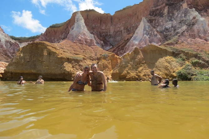 Um dos passeios que fizemos foi Praia do Gunga, uma das mais belas paisagens de Maceió, apesar de ficar no município de Barra de São Miguel, a 33 km ao sul. Chegando ao porto da Barra de São Miguel, pegamos uma escuna, que nos levou até a praia do Gunga; o percurso durou cerca de 20 minutos e foi muito gostoso, pois já fomos apreciando as belas paisagens pelo caminho. Essa praia está localizada dentro de uma propriedade particular, uma fazenda de coqueiros, por isso ela é uma grande extensão de areia branca acompanhada por centenas de coqueiros, formando uma paisagem única, cartão postal de Maceió. Há muitas opções de diversão, além de curtir a praia, como passeios de buggy, de jangada, de lancha; optamos pelo buggy, que “com emoção” nos levou por um caminho de pura diversão até as falésias de areias coloridas, onde foi possível subir a pé até um de seus pontos altos e avistar o mar por um ângulo incomparável. Além disso, o percurso ainda incluiu um banho refrescante na lagoa ao pé das falésias, e uma “auto-pintura corporal” com as areias coloridas, que segundo dizem, possuem propriedades cosméticas; a verdade é que ficamos muito engraçados com os corpos pintados. Foi divertido.