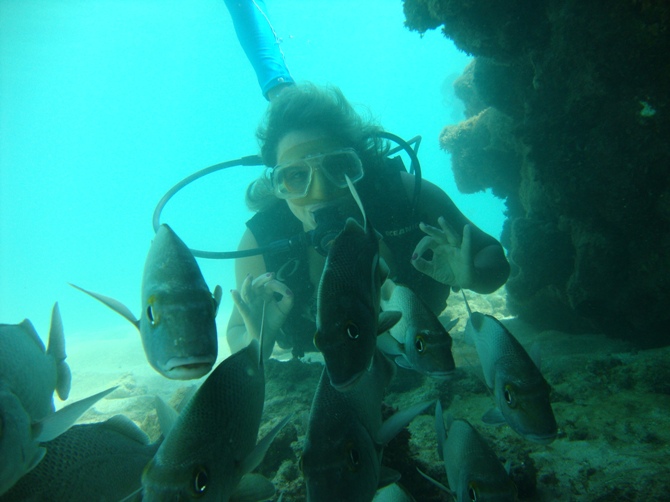 Tínhamos muita vontade de experimentar o mergulho de cilindro, mas estávamos um pouco receosos. No local, eles nos ensinaram, na prática, como usar o equipamento e nos comunicarmos debaixo d’água. Como era um local de pouca profundidade e com acompanhamento do guia, lá fomos nós mergulhar. Foi incrível! Poder chegar bem pertinho de tantas belezas submersas, de peixes de várias espécies, cores e tamanhos, dos corais e seus recônditos, da rica e colorida vida marinha. E tudo foi registrado em fotos, esse é um serviço opcional e não é caro.
