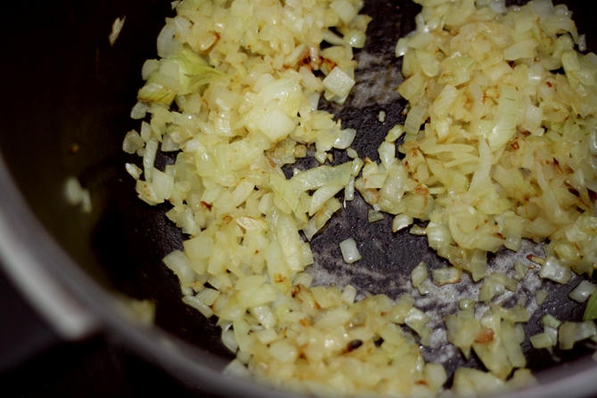 Para o recheio eu refoguei 1 cebola média picada até dourar.