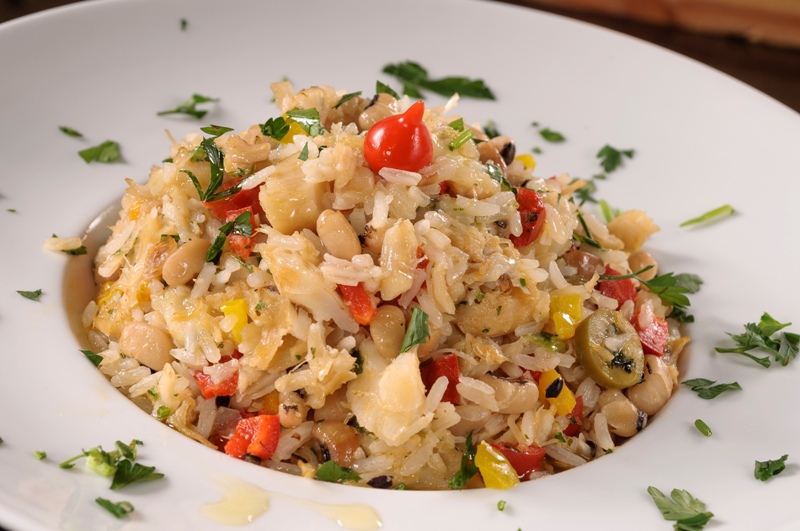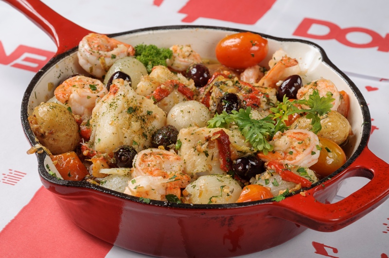 Donamena: Grande Encontro – Lombo de bacalhau Gadus Morhua, camarão e hadock refogados em azeite com temperos frescos, cebolas, batatinhas e azeitonas portuguesas, confit de tomatinho, pimentão e alho dourado, acompanha arroz branco. Porção para duas pessoas: R$119,00