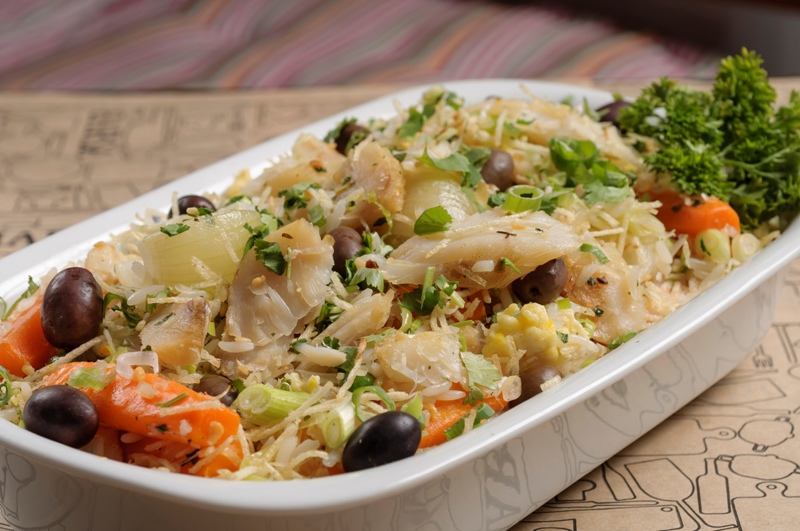 Barsa: Bacalhau ao Brás – Lascas de bacalhau Gadus Morhua refogado no azeite com alho e especiarias frescas, batata palha, ovos mexidos, arroz, cebolas, azeitonas portuguesas, cenoura e alho dourado. Porção para duas pessoas R$98,00