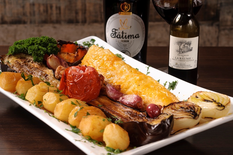 Gruta São Sebastião: Bacalhau de Aveiras- filé de Morhua assado com berinjelas, tomate, cebola, alho assado e batatas coradas (na compra do prato para duas pessoas, ganha uma garrafa de vinho tinto ou branco do tipo Comté Tolosan – 187ml reserva). Para duas pessoas R$151,00 (com vinho) e Individual R$69,00 (sem vinho).