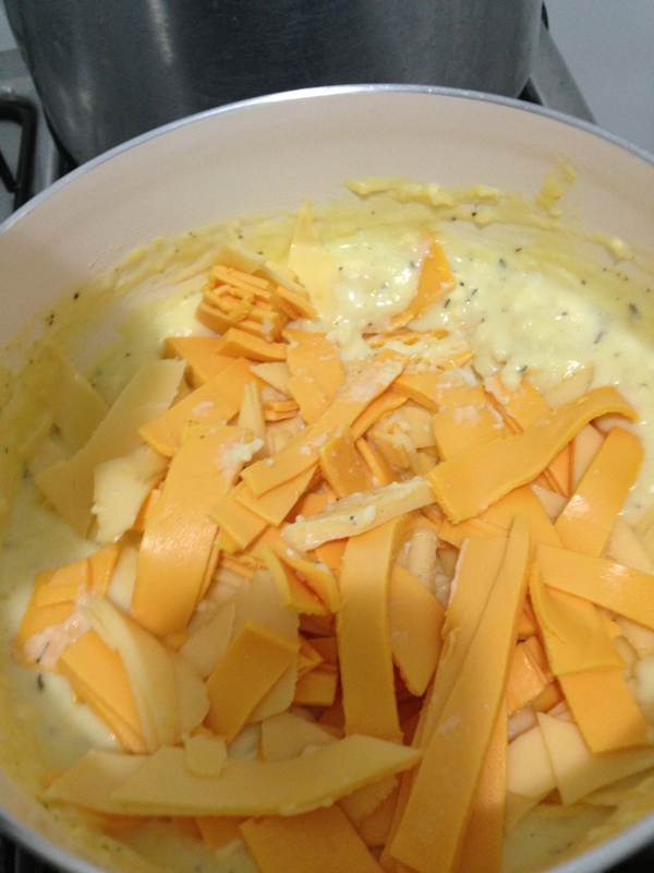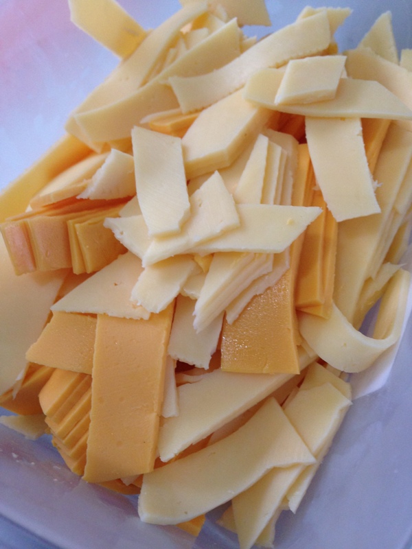 Fatie o queijo cheedar e prato em pequenos pedaços, fatie meia cebola e corte em pedaços pequenos, coloque a água do macarrão para ferver e depois que ferver, coloque o macarrão para cozinhar.