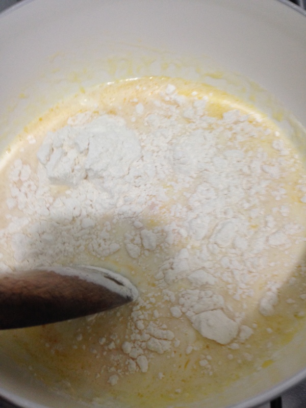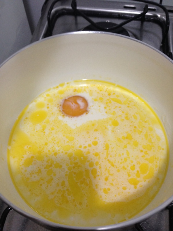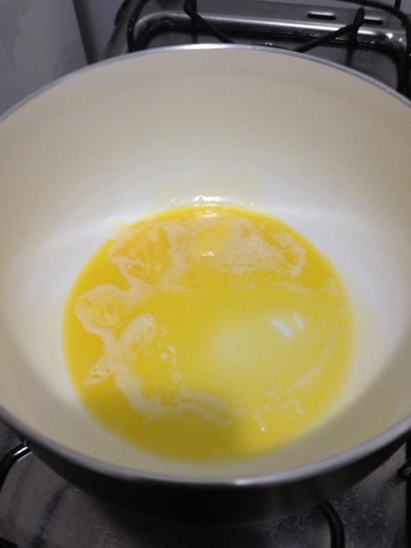 Na panela coloque o tablete de manteiga e deixe derreter por completo. Acrescente duas xícaras de leite, ovo e as três colheres de farinha de trigo e comece a mexer.