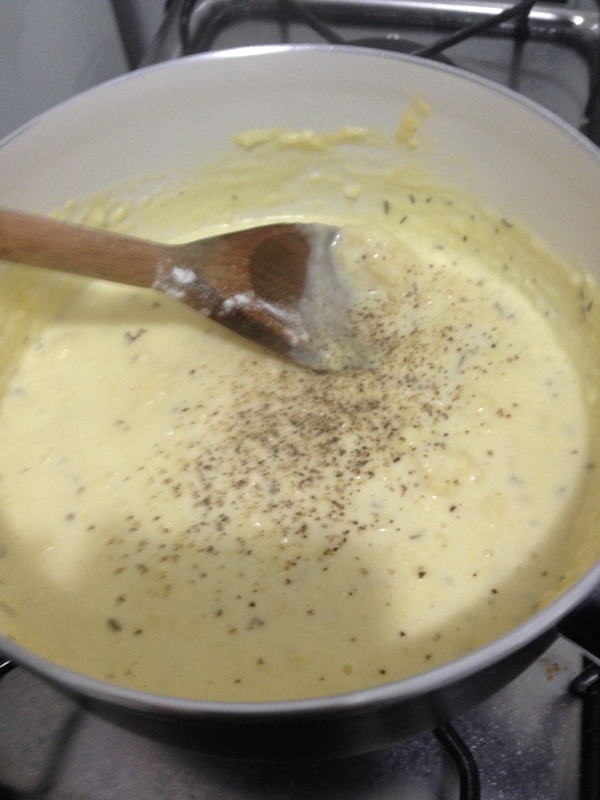 Enquanto mexe, acrescente o tempero: sal, pimenta preta moída, noz moscada e outros de sua preferência. Acrescente o queijo e a cebola e continue mexendo! Pode ir acrescentando leite aos poucos até que fique um molho bem cremoso.