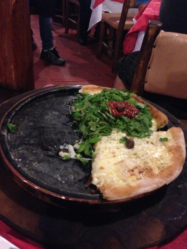 Não é comum pedir entrada quando o prato principal é pizza, mas ficamos bem interessados nos bolinhos de milho, que são bem comuns nessa região. Então, resolvemos apostar em uma porção de bolinhos de milho mesclados com bolinhos de bacalhau. Ela veio bem servida e custo um pouco mais de R$30.