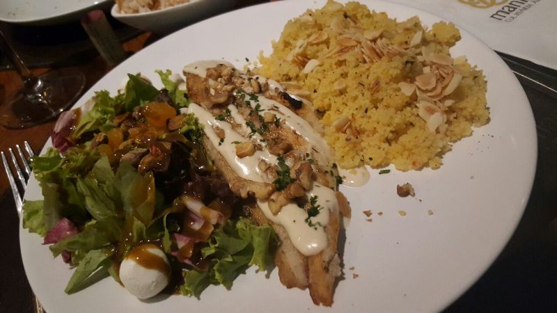 De prato principal as opções escolhidas foram o Filé de pintado – filé de pintado grelhado, com molho tarator e nozes com cuscuz marroquino (grãos de sêmola puxados no azeite com cebola roxa, pimentões vermelhos e amarelos, com um toque de hortelã) e salada manish mix de folhas verdes, queijo de cabra, damasco e pistache, temperados com molho a base de mel e balsâmico e o Fatte – tiras de filé mignon refogado servidas sobre berço de pães com especiarias árabes, coalhada fresca e grão de bico coberto com hortelã fresca, snoubar e amêndoas. Acompanha arroz chehie.