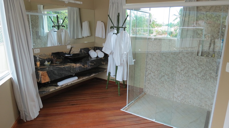 Já o almoço e o jantar não estão inclusos no pacote e fica a critério dos hóspedes. Na nossa visita, experimentamos uma das especialidades da casa, o Risoto de Palmito com Camarão ao Molho de Ervas Frescas. O prato serve uma pessoa e tem o valor de R$79.