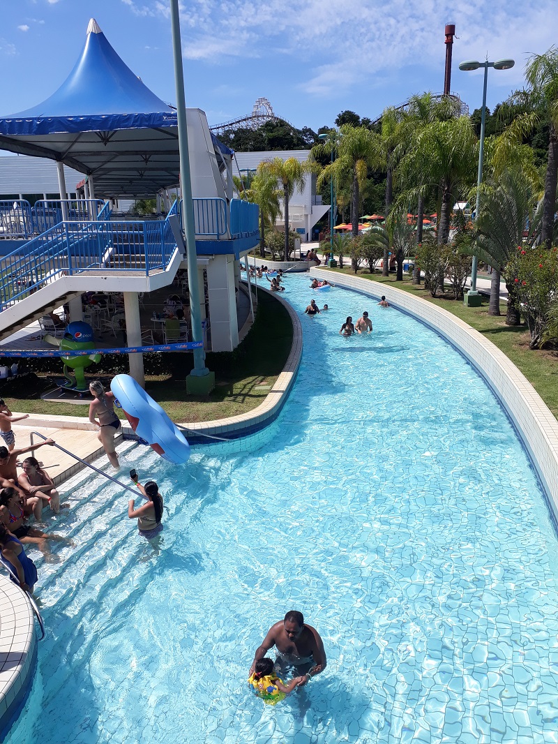 Como ficamos descalços o tempo todo e, andar na área acimentada pode queimar um pouco a sola do pé, há opção de ir de uma atração a outra pela piscina em forma de rio, que circula por todo o parque e apresenta uma correnteza leve e agradável.