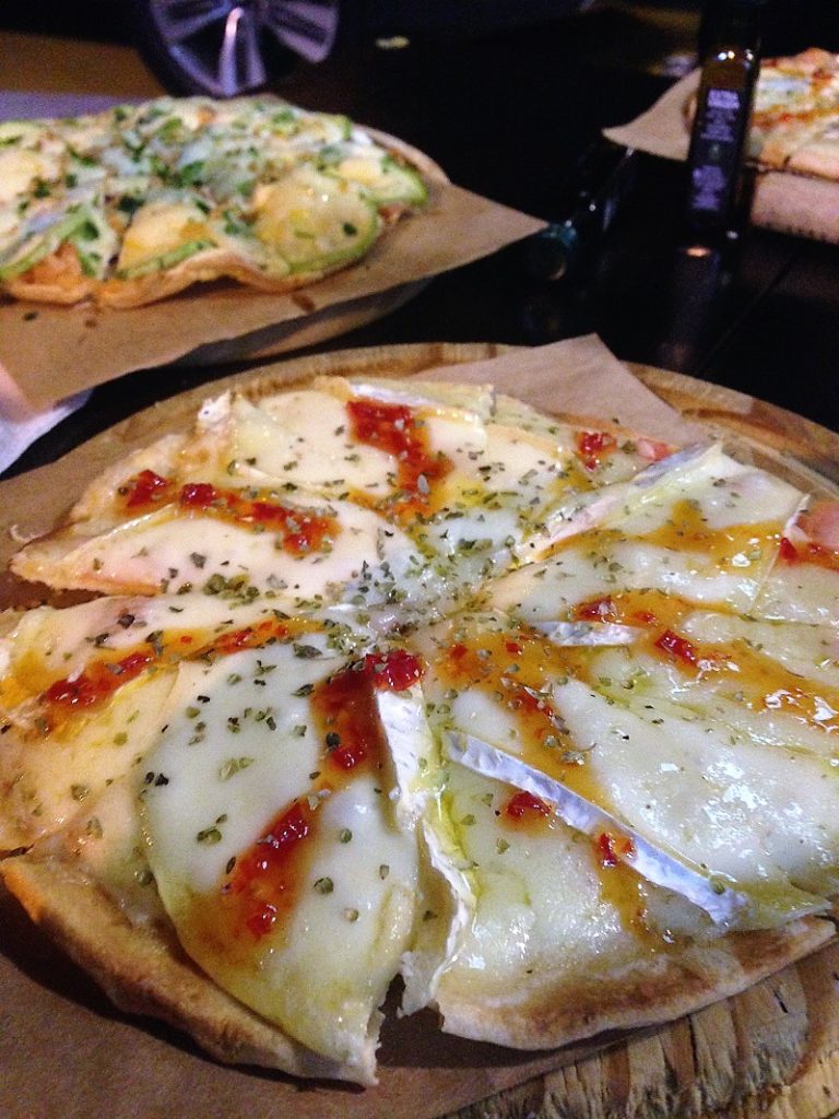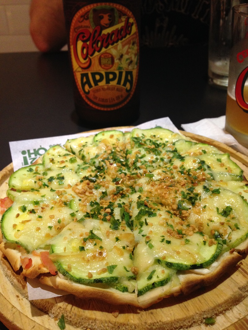 Nossa aposta foram nas pizzas de abobrinha (cream cheese, abobrinha com tempero da casa, provolone, cheiro verde e alho frito) — segundo dizem a mais pedida da casa e tem lá seus motivos —, pesto (molho pesto de manjeiricão, mussarela, parmesão, tomate cereja e orégano), cogumelos (cream cheese, cogumelo fresco, parmesão e alho poró), Le Brie (mussarela e queijo bire com geleia de pimenta e orégano) e a caprese caveira (mussarela de búfala com linguiça italiana curada, tomate cereja, pesto de azeitona preta e manjeiricão).