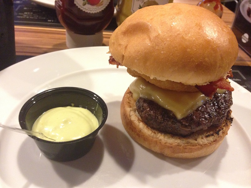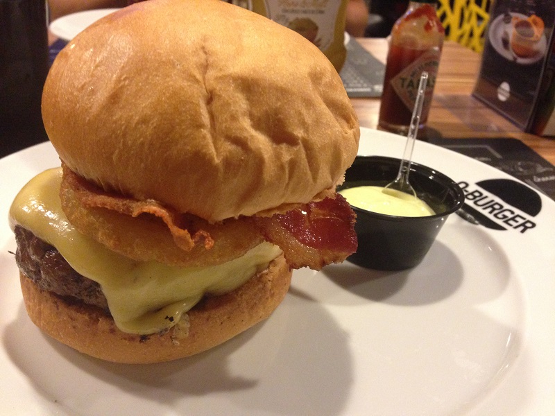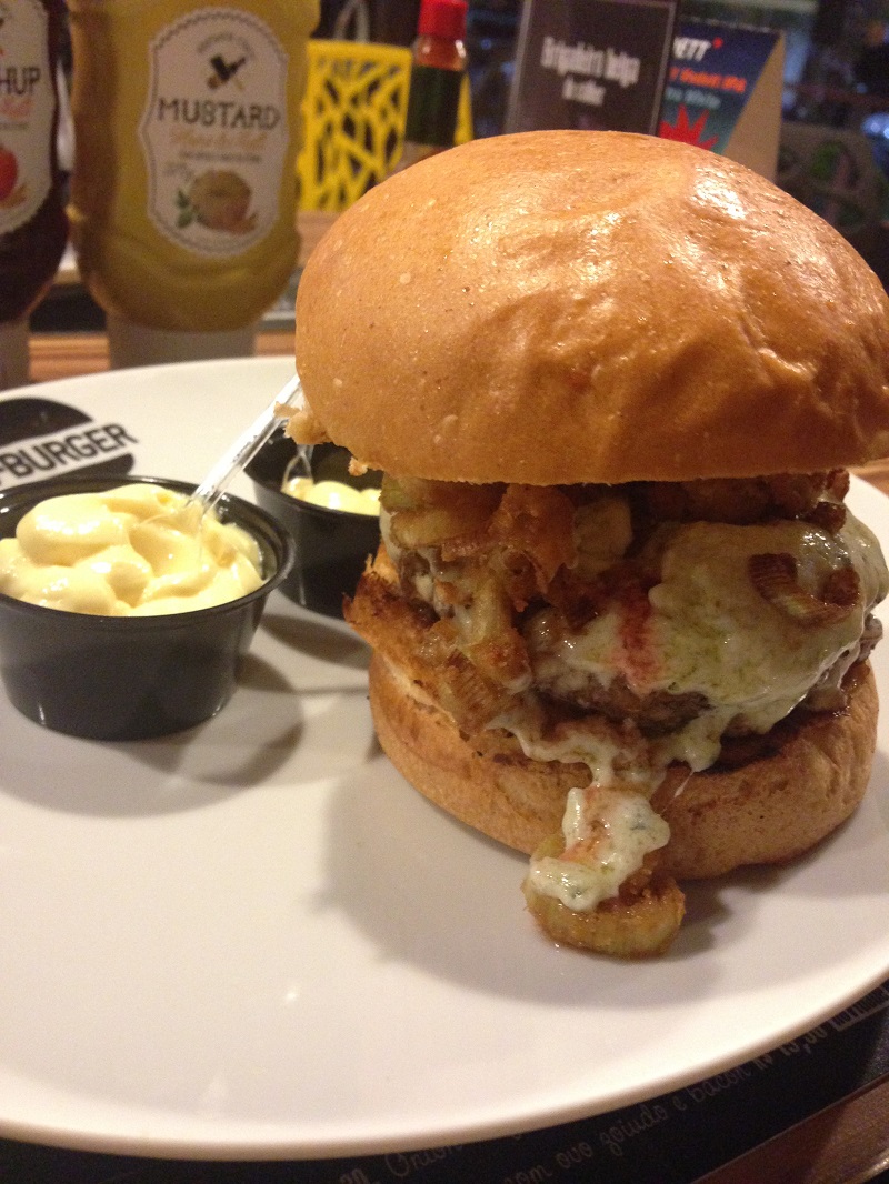 Optamos pelo Q-Burger Powerhambúrguer, onion rings, queijo emental, bacon frito e maionese de wasabi e o Q-Burger Chimichurri – hambúrguer, queijo muçarela, tomate e molho chimichurri. Acompanha maionese da casa!