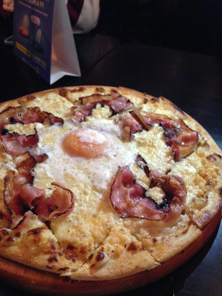 As pizzas também são uma opção para quem quer comer como aperitivo e optamos pela Pizza de Carbonara Al Pecorino — creme de ricota, mussarela fresca, pecorino ralado, panceta defumada e ovo caipira pelo valor de R$31,99. Um dos pedidos mais que mais gostamos!