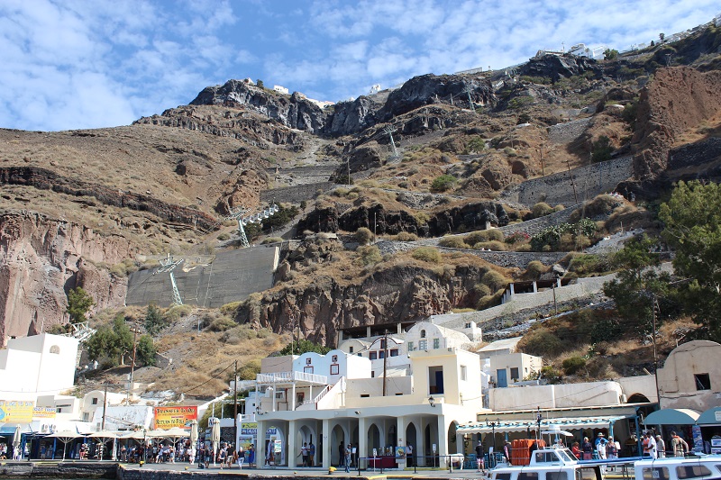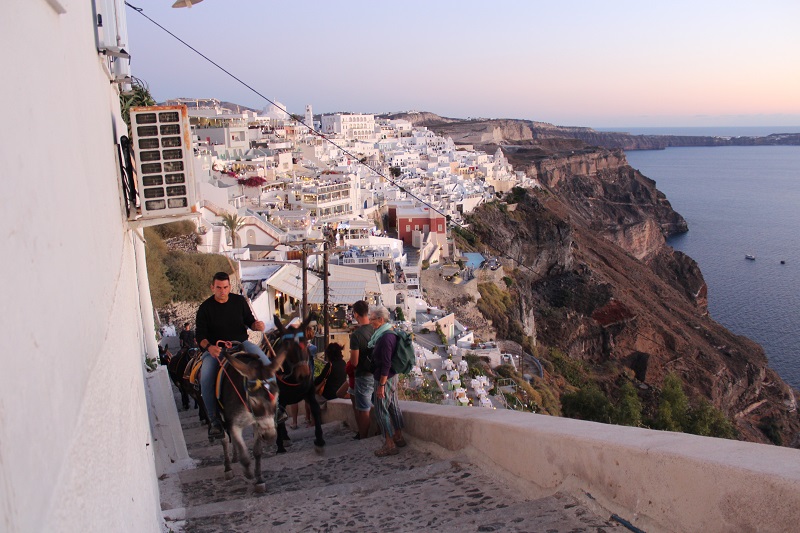 Santorini tem muitas pirambeiras e montes de mais de 300 metros de altura, então, descer ao porto velho não é tão simples a pé. A escadaria é extensa e no sol escaldante você pensa duas vezes antes de se aventurar por esse caminho.