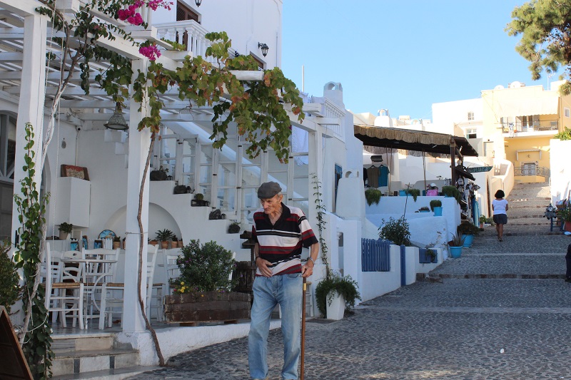 A geografia é muito interessante com pouca vegetação, solo arenoso e vulcânico e a beleza do mar Egeu escuro de todos os lados do formato em “C invertido”.  A população santorinhós vive a vida de forma peculiar aproveitando e respeitando cada momento que a ilha passa seja na bonança ou na escassez. Os nativos são bairristas e tem um amor sem igual por Santorini. Afinal, é uma ilha propensa a terremotos e a erupção do vulcão, então tudo é aproveitado até o último segundo. Não deve ser fácil trabalhar de junho a outubro para viver o resto do ano.