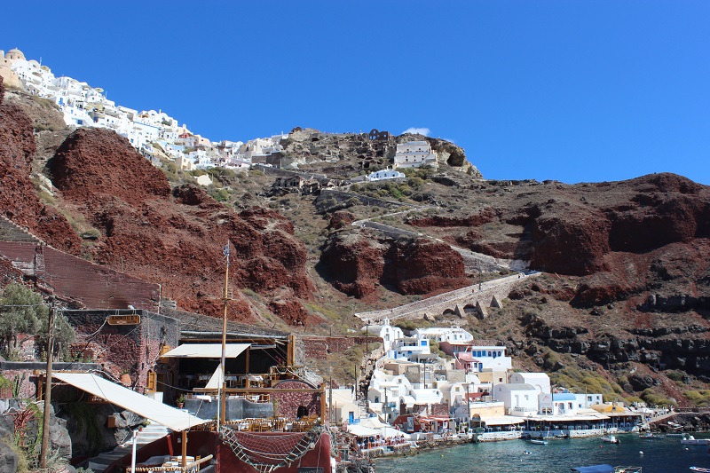 Do centro de Óia até Amoudi Bay é preciso descer a escadaria com 250 degraus. Dá para ir de carro também cortando por trás e é muito fácil estacionar. Vale a pena ver o pôr do sol de lá e apreciar a bela vista de Óia, vista de cima.