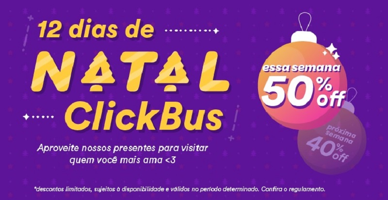 A ClickBus, empresa líder em vendas online de passagens rodoviárias, oferece nas próximas duas semanas descontos de 50% e 40% em passagens de ônibus nas rotas selecionadas e para quem quer viajar nas comemorações de Natal e Ano Novo. Quem garantir as passagens com mais antecedência, ainda nesta semana, terá o desconto de 50%, já do dia 18 até 24 de dezembro as passagens estarão com 40% de desconto.