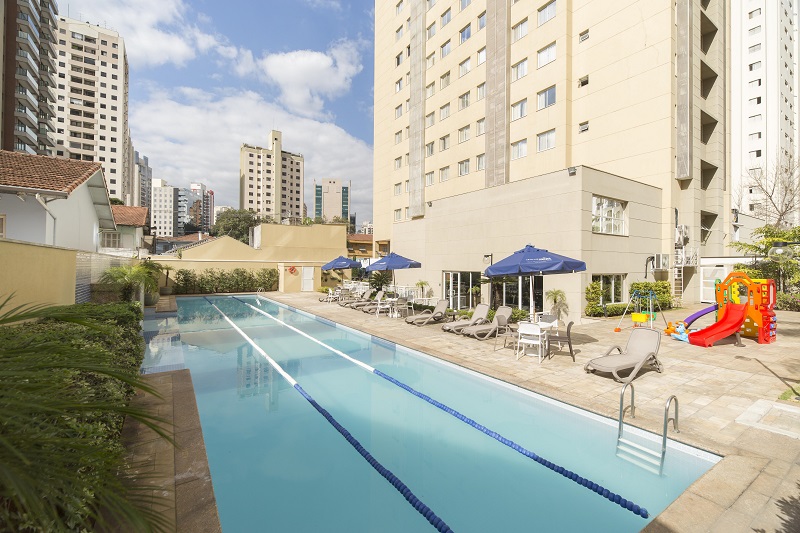 Além da piscina e academia, o hotel possui um belo solário e tem vista para a ponte Octávio Frias de Oliveira, um dos mais famosos cartões postais da cidade. Oferece Wi-Fi gratuito, dispõe de parquinhos infantis cobertos e ao ar livre, além de um clube infantil. O pacote de 6h sai por R$ 159,00.