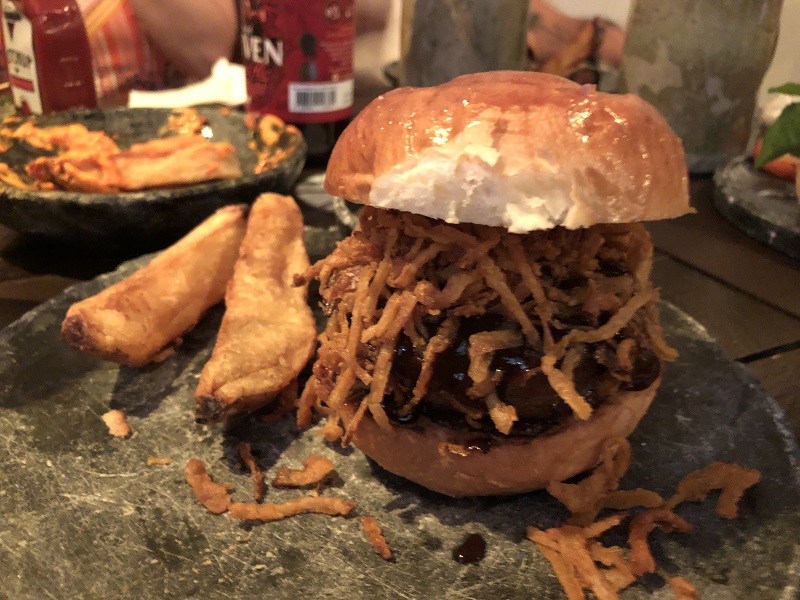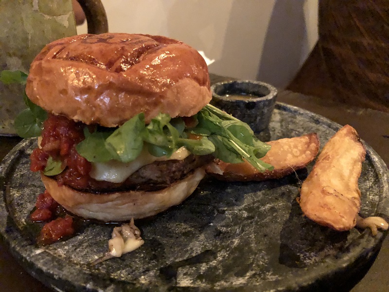 O Bárbaro – hambúrguer de javali (180g), queijo caciocavallo, rúcula e relish de pimentão defumado no pão tradicional