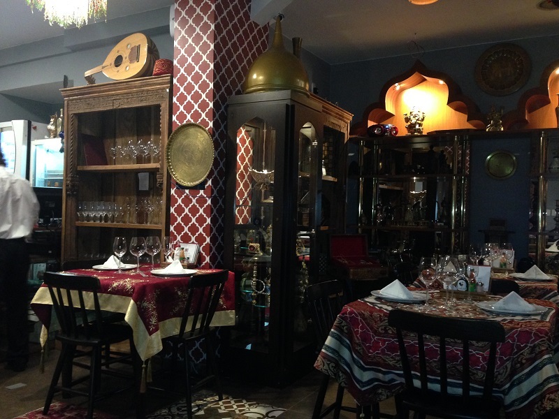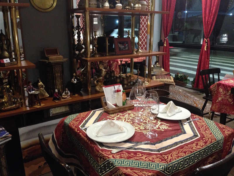 A noite a decoração intimista e árabe é ainda mais marcante. Com mesas com toalhas vermelhas bordadas com símbolos dourados. a casa tem diversos lustres e artefatos de decoração. O interessante é que estão todos a venda! Mais árabe impossível!
