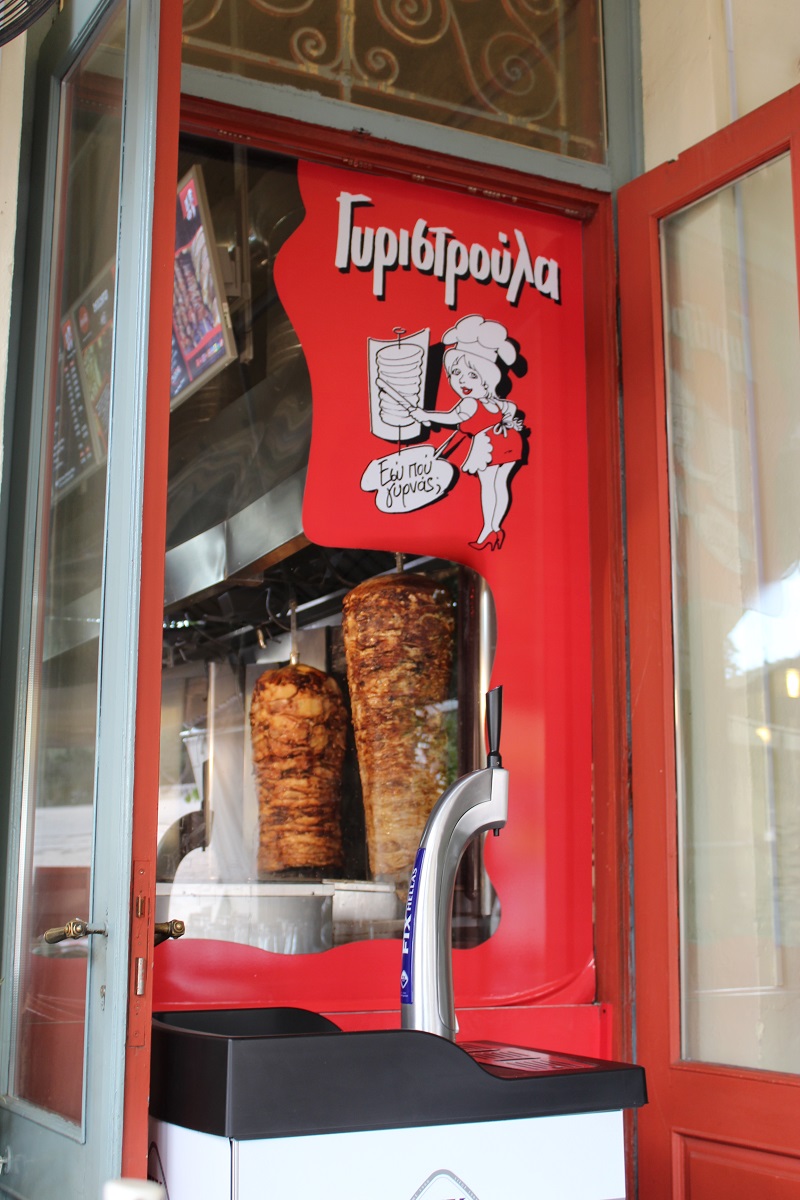 Ficamos somente um dia em Atenas e resolvemos explorar a cidade a pé pelos arredores da acrópole.  Descendo a acrópole de Atenas em direção ao mercado aberto de Monasteraki, em uma espécia de praça, próxima a uma Estação do metrô, fomos surpreendidos com o restaurante Gyristroula, tipicamente grego e com preços ótimos.